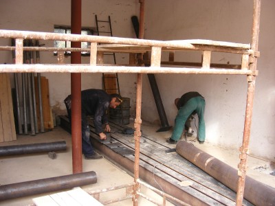 Dne 3. 10. 2013 začaly samotné práce na rekonstrukci spočívající ve vyklizení garáže od požární techniky a zhotovení patek pro nosné sloupy pro podepření stávajícího stropu. V průběhu stavby jsme zajišťovali různé pracovní činnosti – viz stavební deník. Práce pokračovaly ve vnitřních prostorách i v zimních měsících a to díky mírné zimě, kdy byly zhotoveny podlahy, byla zavedena elektroinstalace, bylo provedeno omítnutí a zateplení stěn a stropu garáže, na který byl následně instalován na připravený rošt sádrokarton.